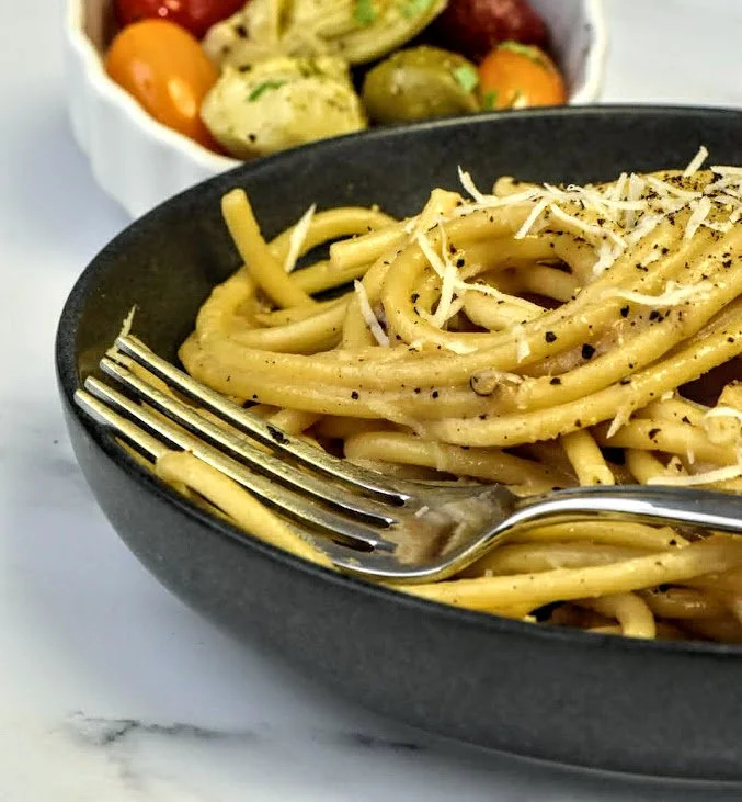 4. (Don’t drain the pasta.) Add a ½ cup of hot pasta water to the pan with the black pepper and bring to a boil. Using tongs, add the undercooked pasta to the pan and continue cooking until al dente. (not mushy!)