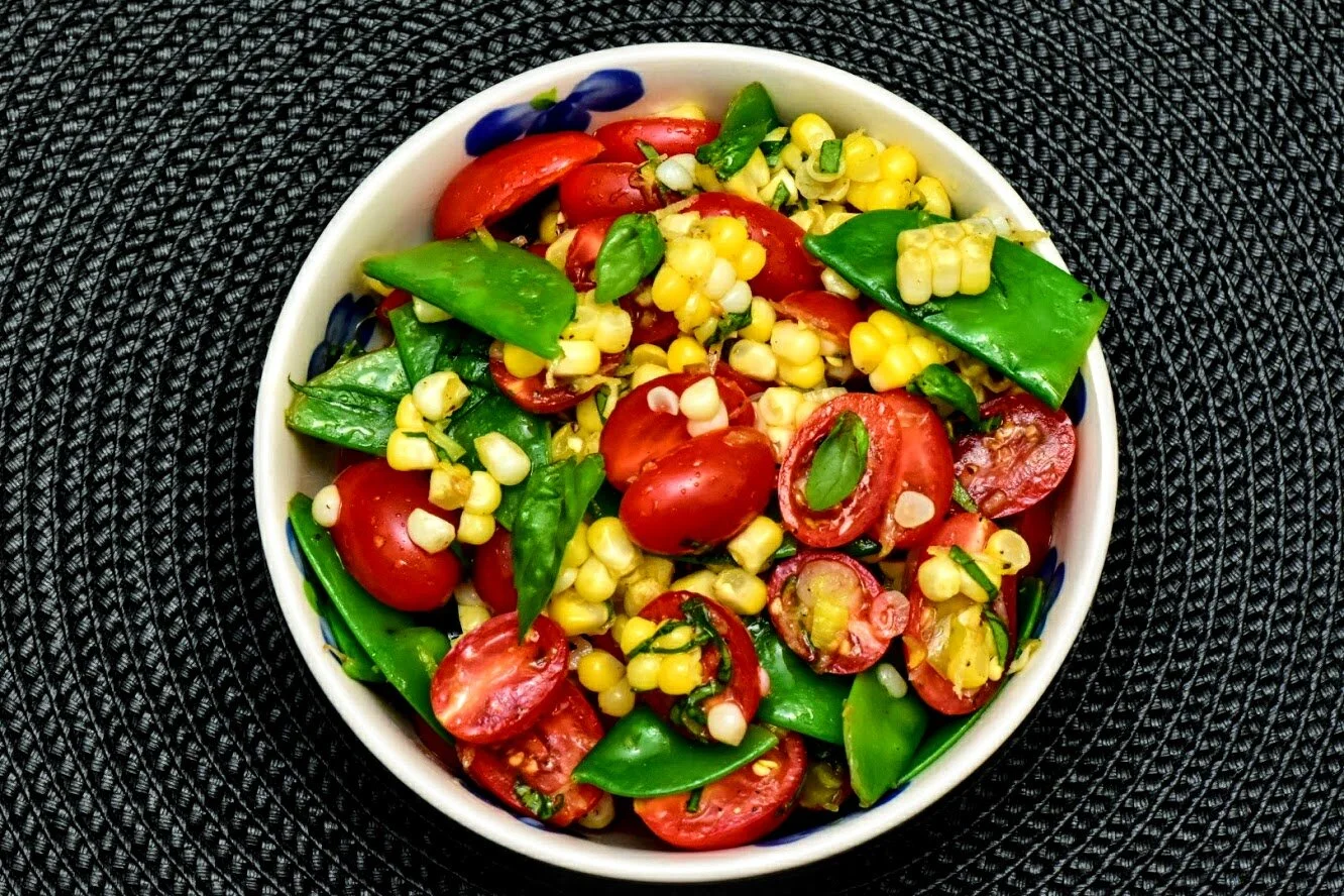 3. In a small bowl, combine kernels, tomato, snow peas, basil, lemon juice, Tabasco, and salt and pepper to taste, and toss lightly. Set aside for at least a half-hour for the flavors to meld.