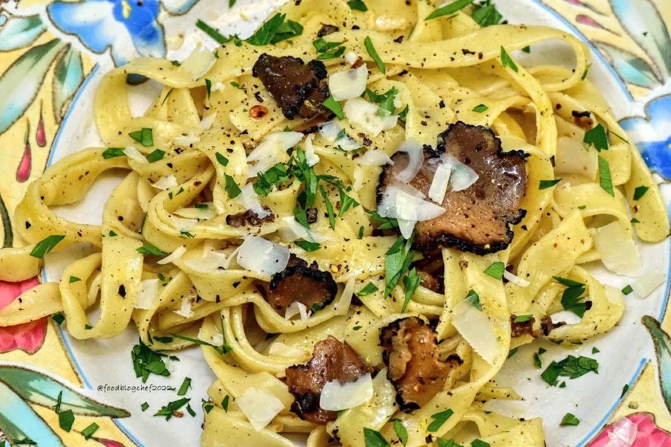 8. Plate the truffle fettuccini garnished with chopped parsley and grated cheese.
