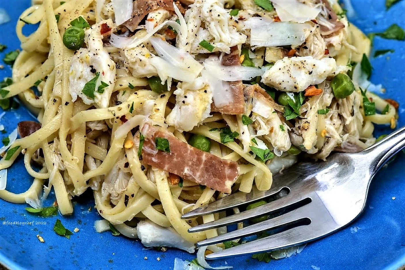 3. Add the wine and boil until reduced by half, about 2 minutes. Add the crab, green peas, thyme, and oregano and toss until hot.