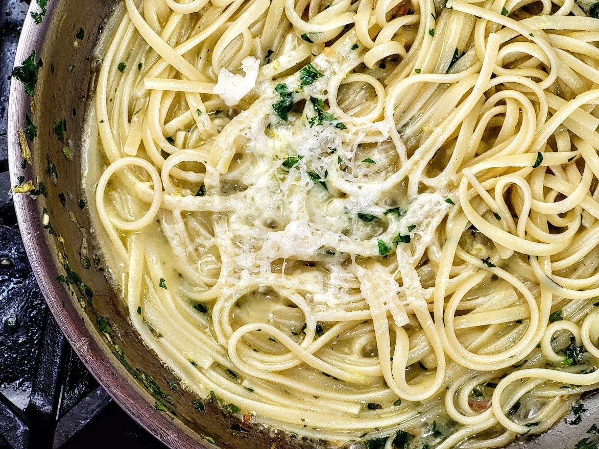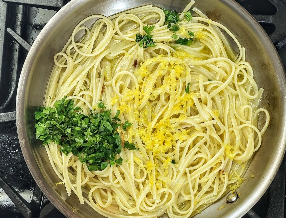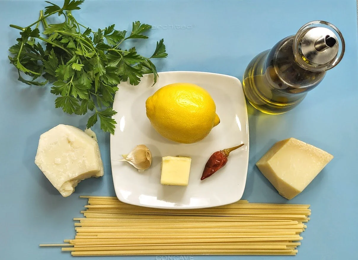 linguini, lemon zest, lemon juice, garlic, hot red pepper, parsley, oilive oil, butter, Pecorino Romano, parmesan