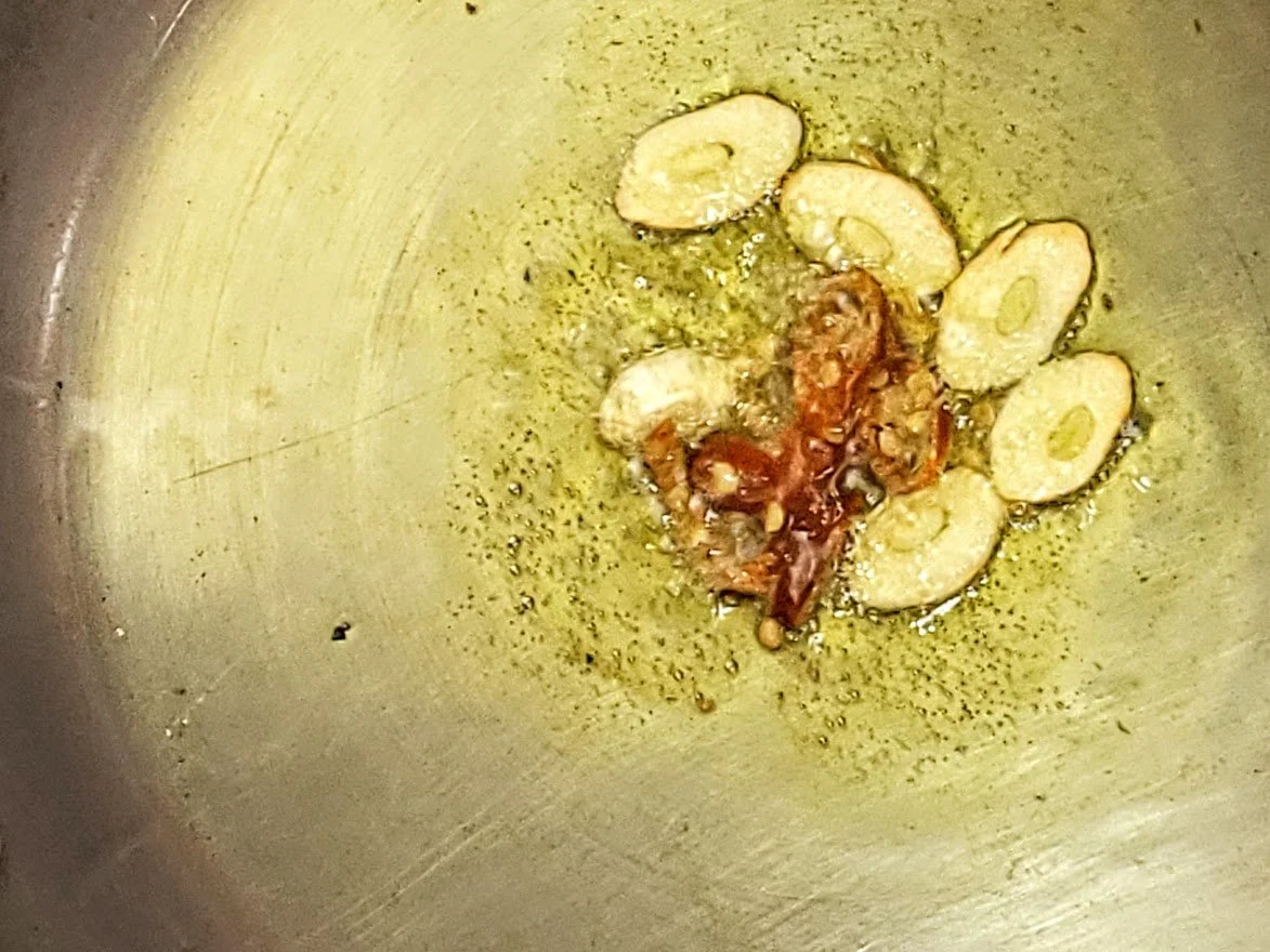 2.  Over medium heat, sauté the garlic and red pepper in the olive oil for a minute or two until fragrant. (don't burn!)