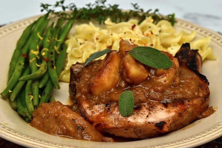 Preheat your grill and grill the pork chops over direct heat, with the lid closed, 4-6 minutes per side depending on the thickness, turning once. For juicy pork chops, the chops should still be barely pink in the middle and a meat thermometer registers an internal temperature of 140°F. Alternatively, pan-fry the chops in a grill pan or oiled cast-iron skillet for about 4-5 minutes per side and a meat thermometer registers 140 F. Tent and rest the chops for 5 minutes for the juices to set into the meat before serving. Serve with the Apple Sage Sauce, buttered noodles, and your vegetable or salad of choice.