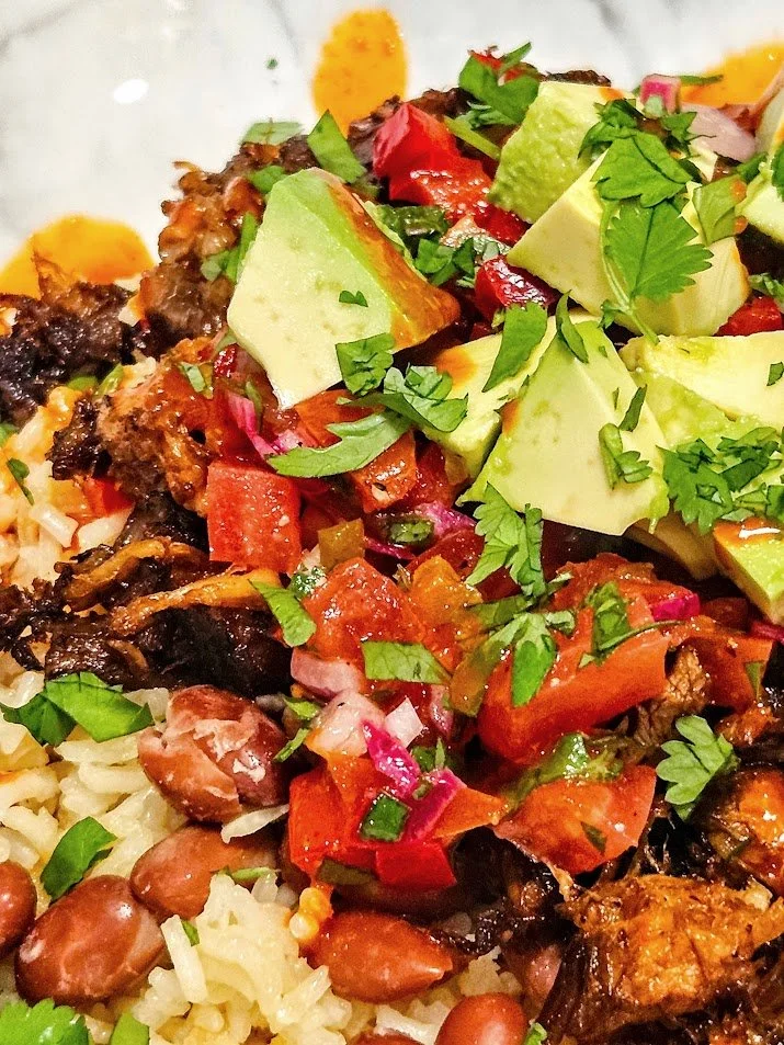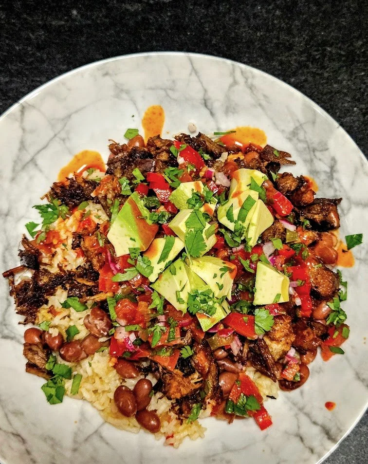 Thanks to our friends at the Blue Rock Restaurant (#thebluerockrestaurant) for introducing us to Chifrijo. (an abbreviation for chi-charrón + frijo-les). Costa Rican chifrijo is a layered dish of rice, tender beans, crispy fried pork (chicharrón), and pico de gallo (Costa Rican chimichurri), garnished with avocado and cilantro and served with tortilla chips on the side. After doing some research, here’s my version. For the crispy pork, I chose to slow-cook locally sourced pork belly from #corsellobucheria for about 2 ½ hours until it was fall-apart tender. Alternatively, if you have left-over pernil, use it as an excellent substitution, or, for less fatty meat, use marinated, slow-roasted, or flash-fried boneless, country-style pork ribs. This recipe can be served either as a main dish or as bocas (“small bites”). Buen provecho!