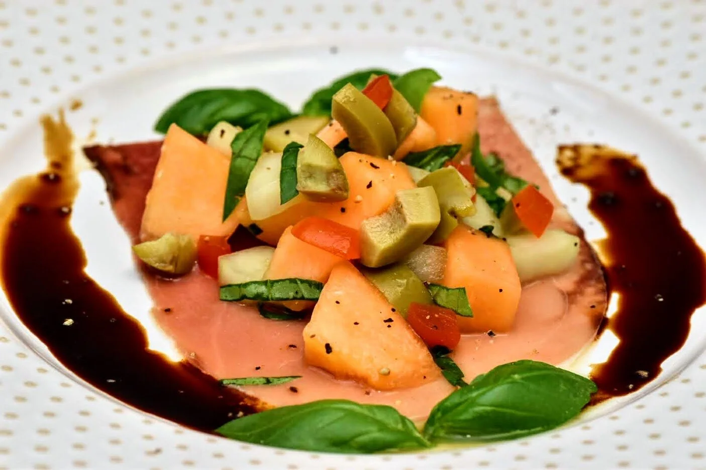 Who doesn’t love sweet juicy summer melon? Colorful and super easy, this starter was inspired by an article by Anna Stockwell for Epicurious in 2018 where she lays down the magical interplay of salty, sour, sweet, savory, and umami with melon. Meaty, pimento stuffed Spanish olives, juicy sweet cantaloupe, crunchy cucumber, and basil dressed with a splash of lime juice and olive oil over a slice of Serrano Ham or Prosciutto with balsamic reduction. Solid alchemical, gastronomic gold!