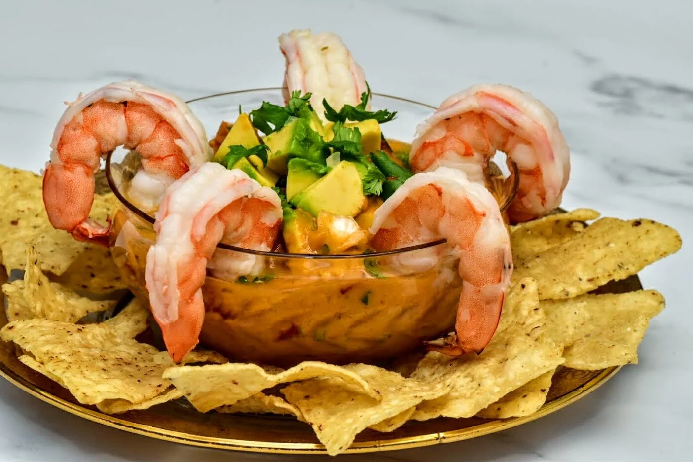 3. Delicately fold in the avocado and shrimp. Spoon into ice cream-sundae or martini glasses and serve with warm tortilla chips.