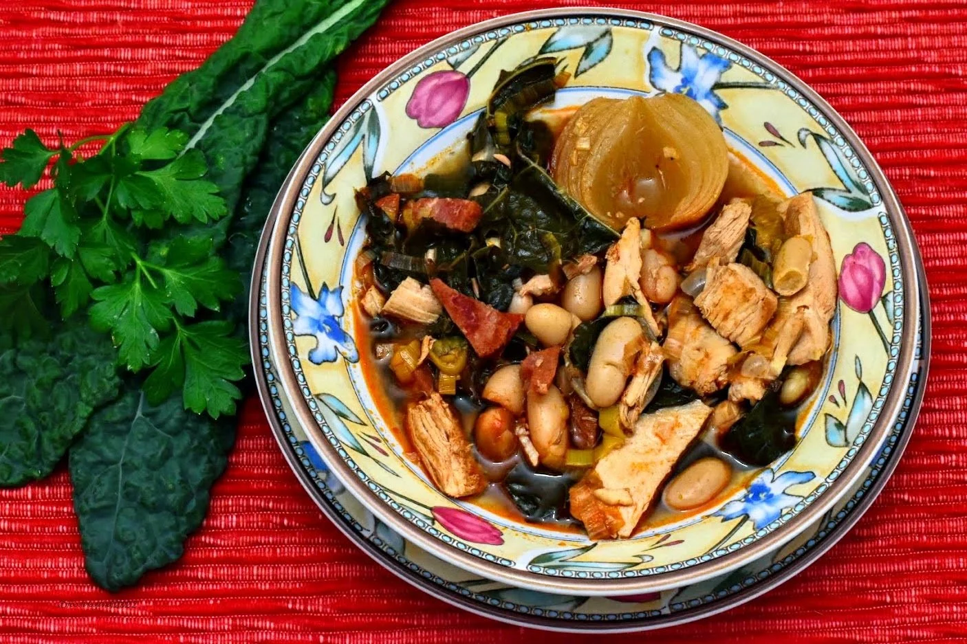 This easy to make soup uses leftover cooked turkey or chicken, canned white beans, and pre-made chicken stock flavored with a smokey sausage like linguiça or chorizo, garlic, leek, and onion. The secret ingredient is Portuguese Red Pepper Paste which is a staple condiment in Portuguese cooking. The soup will still be delicious, hearty, and healthy without the red pepper paste, but this condiment gives the soup its distinctive flavor. I highly recommend you take a few minutes to make a small batch of this delicious flavoring condiment to keep in your fridge. Use it in soups, sauces, or to flavor meat, fish, or poultry.